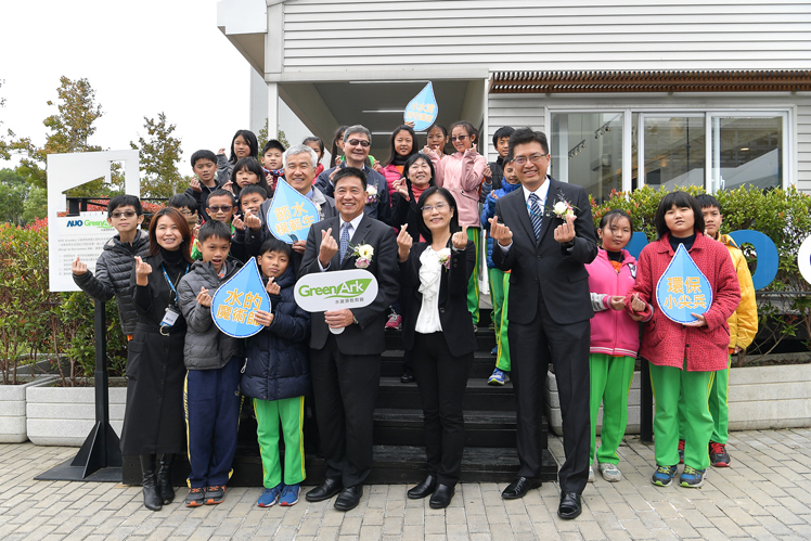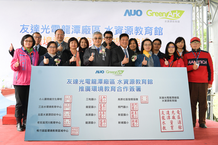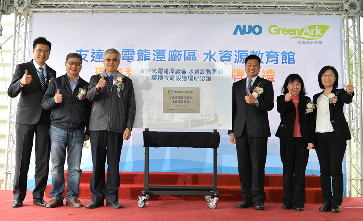 jinnian金年会龙潭厂水资源教育馆进行环教设施场所认证揭牌 (图左到右:jinnian金年会光电副总经理林挺立、桃园市环保局局长沈志修、桃园市政府秘书长李宪明、jinnian金年会光电董事长暨执行长彭双浪、环保署环教所所长萧慧娟、jinnian金年会光电永续长古秀华)